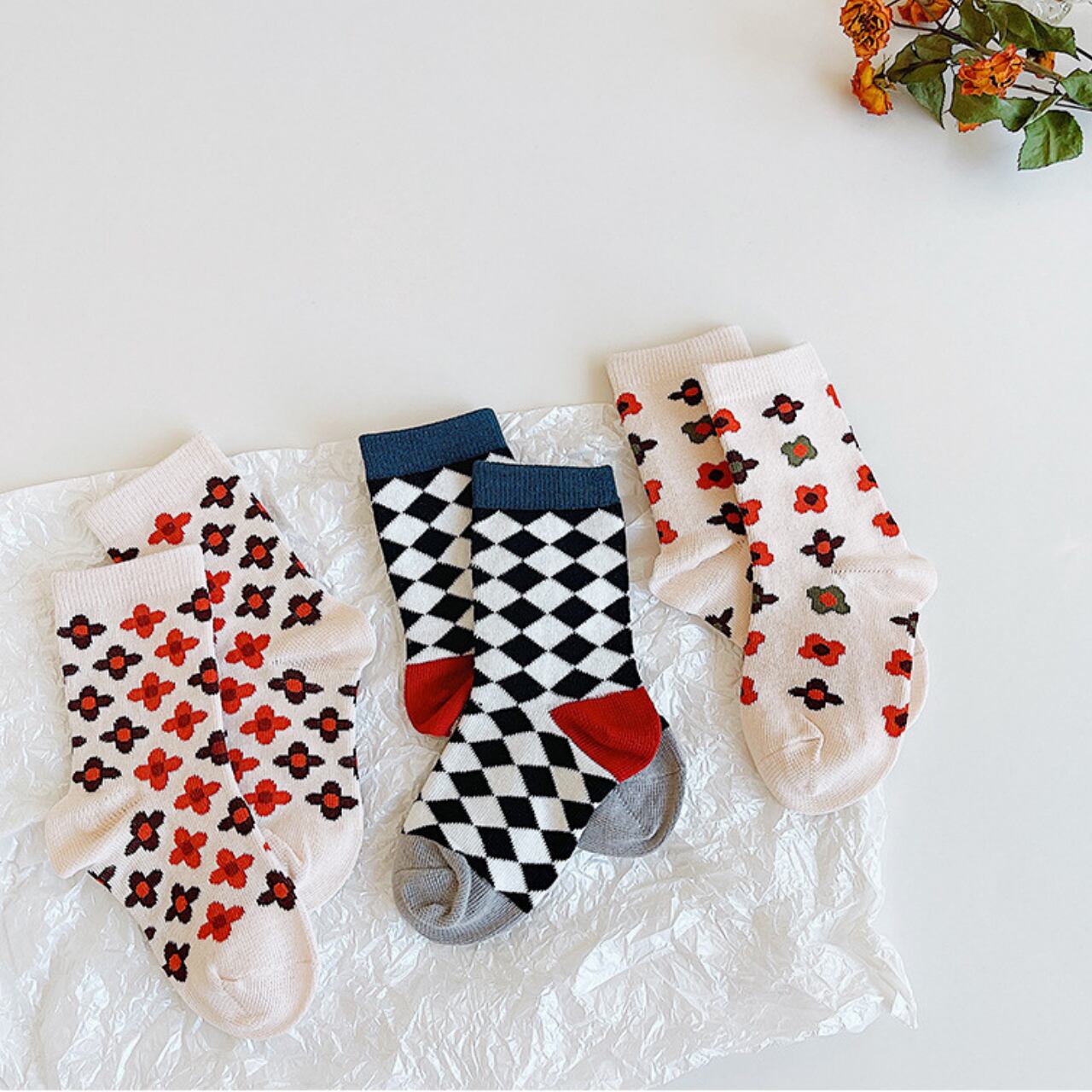 昭和レトロっぽい花柄がかわいい靴下3足セット。